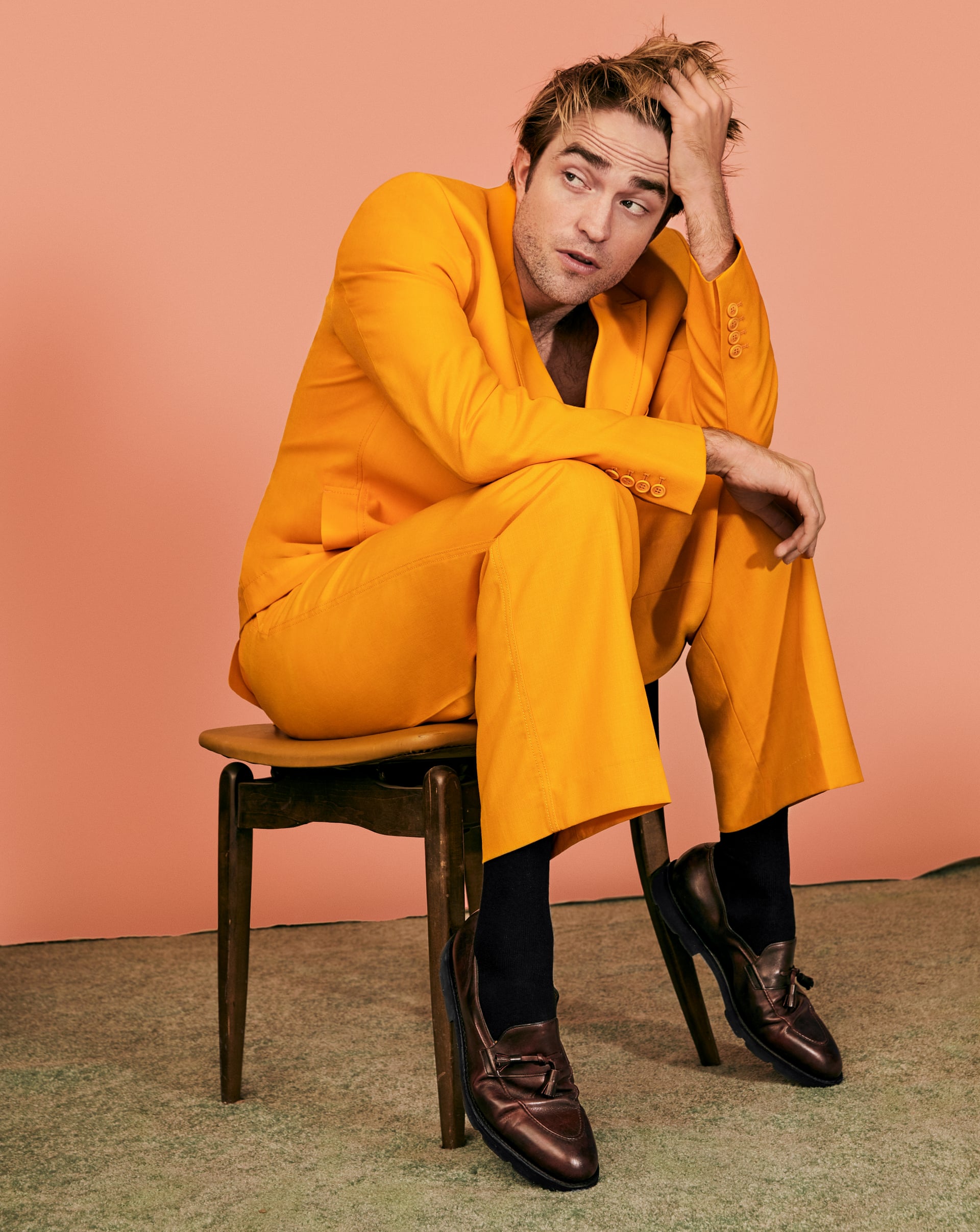 "Soy un catastrofista", dice, riendo. Pattinson se ríe mucho y va por ello: cierra los ojos, echa la cabeza hacia atrás, revela la mandíbula cuadrada y el rastrojo fino y la parte inferior de la nariz ligeramente oblicua, y suelta una risita fuerte y sin filtro. "Siempre estoy pensando que el peor de los casos va a suceder. Entonces, cuando sucede, pienso: ‘¡Gah! ¡OKAY! ¡Estoy preparado!'"