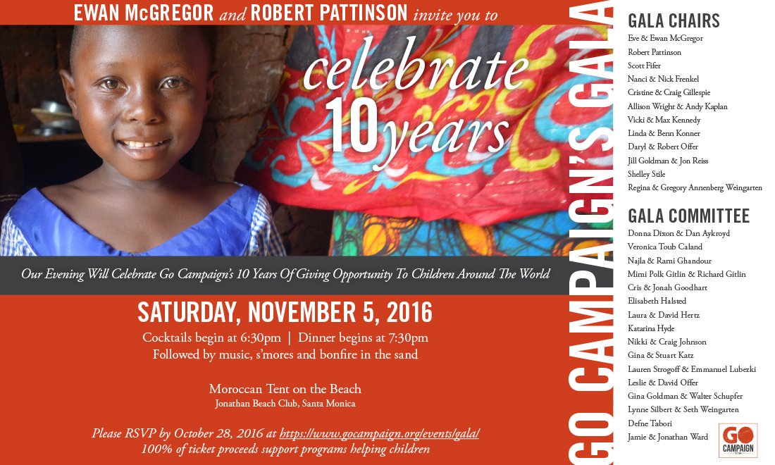 We’re excited to announce that Ewan McGregor and Robert Pattinson will be co-chairing our gala! Get your tickets: https://t.co/kSEhbJI3Xf pic.twitter.com/aWDRLpbzku— GO Campaign (@thegocampaign) 5 de octubre de 2016